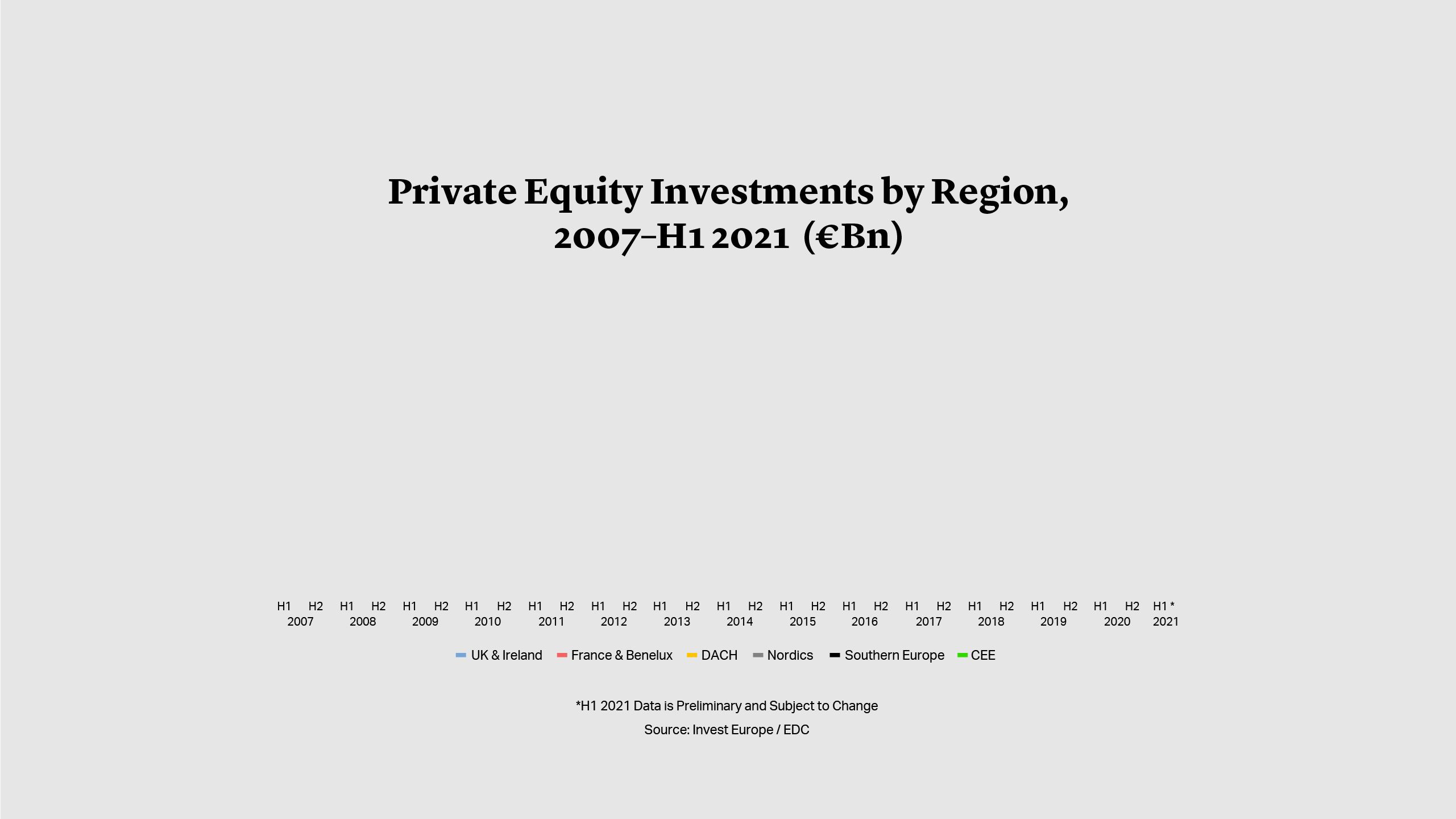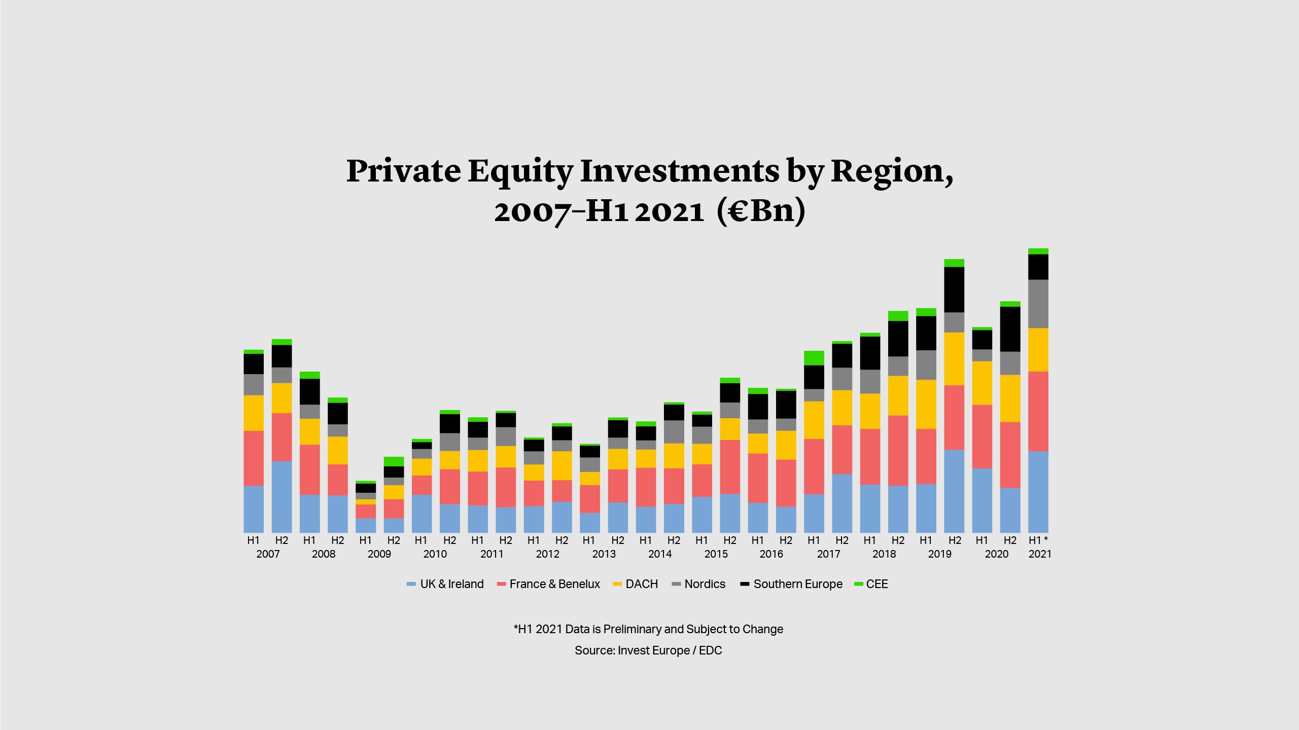 Across Europe as a whole, 2021 private equity investment levels are well into record territory. However, at the country or regional level, activity is more varied. According to Invest Europe data, France & Benelux and the Nordics witnessed record investment in the first half of the year6, while investment in DACH, Southern Europe and Central and Eastern Europe were all below previous highs. However, the largest region for investment during the period was the UK & Ireland.