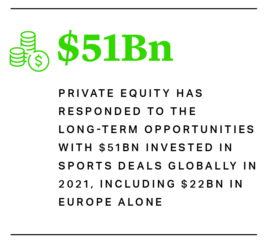 Already on the rise over the last five years, the COVID-19 pandemic served as an accelerant for private equity investment in sports. On the one hand, lockdowns hit revenues from traditional sources, such as gate receipts, putting pressure on team finances which in some cases were already struggling due to high spending on top talent. On the other, they highlighted the seemingly insatiable demand for sports content – often through digital channels. Fans might not have been moving through turnstiles, but they had not abandoned their favorite teams.