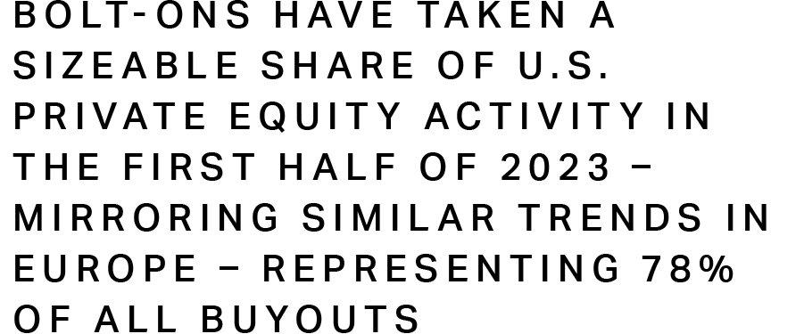 As a result, bolt-ons have taken a sizeable share of U.S. private equity activity in the first half of 2023 – mirroring similar trends in Europe – representing 78% of all buyouts, according to Pitchbook2.