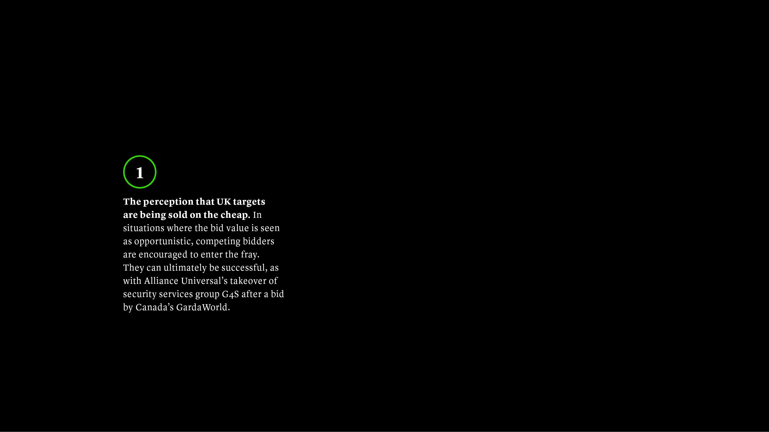 The UK government, which importantly will soon introduce significantly enhanced national security laws, also has a history of seeking to intervene in bids on grounds which seemed tangentially related to national security. An undertaking to maintain British employment was sought from Advent International in its takeover of defence and aerospace group Cobham, ostensibly on the grounds that the UK’s nationality security was threatened.