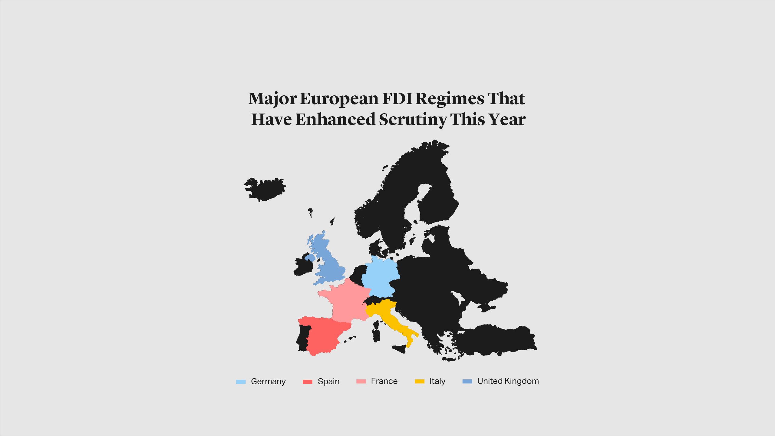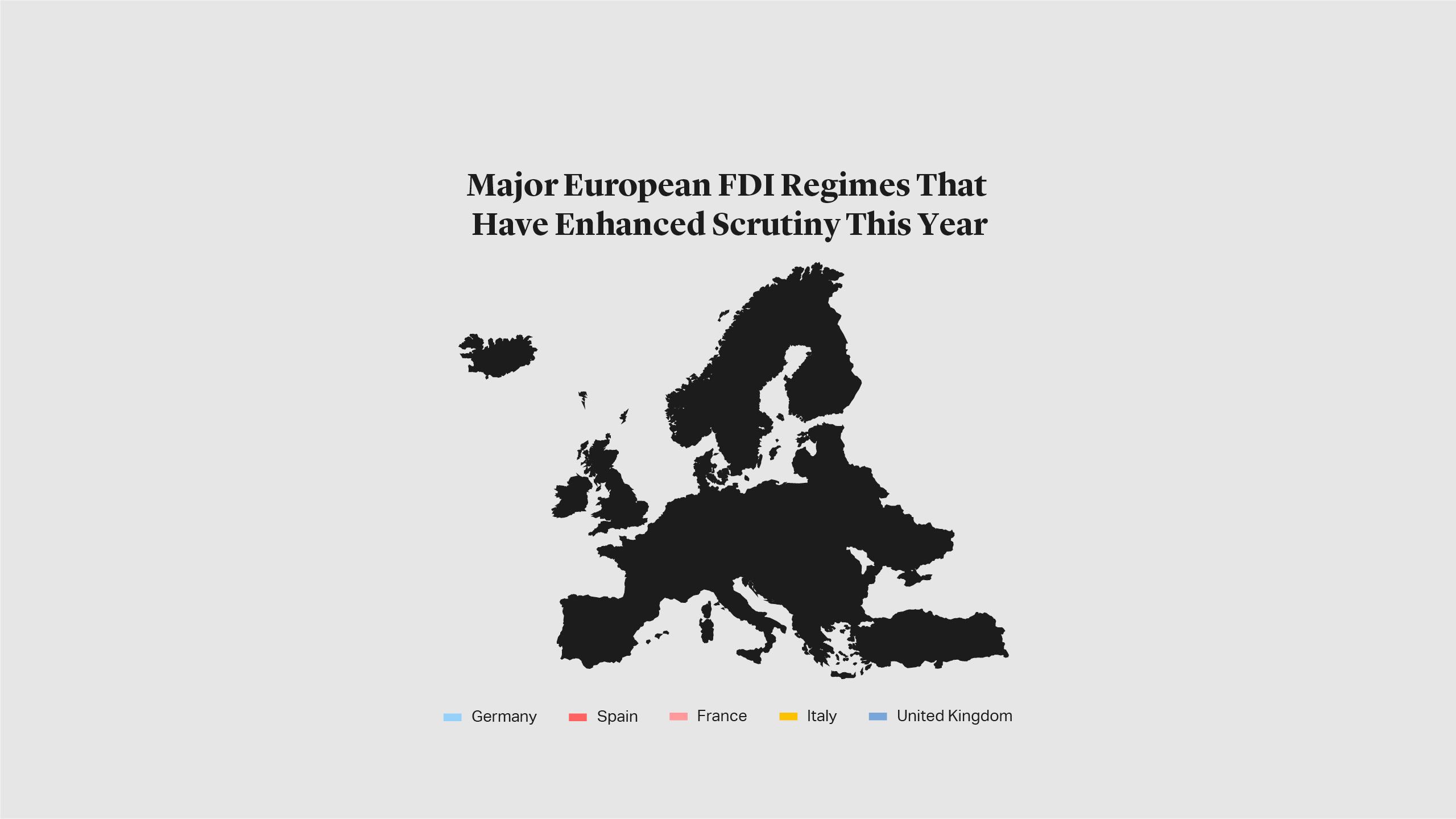 Since the COVID-19 outbreak, several EU countries have enhanced FDI scrutiny or made statements about increased oversight. For example, Spain amended its FDI regime in March, making it necessary to obtain approval for certain types of FDI involving businesses in “strategic sectors” (which correspond largely to those envisaged in the FDI Regulation passed by the European Commission that will come into force later this year). In April, Italy expanded its pre-existing power to review transactions involving FDI to cover additional market sectors, including those related to food security and high technology business. France and Germany have also revised their FDI regimes in the past few months.