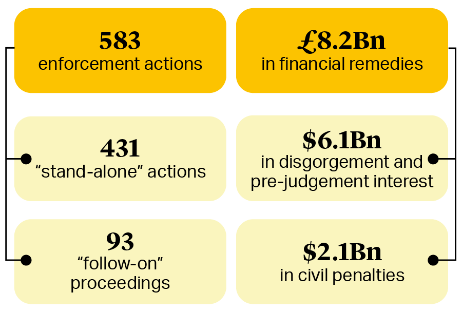 This is not to say that the SEC put its foot on the brake altogether. Enforcement activity, in stark contrast to rulemaking, continued at high speed even through the last day of the outgoing administration in January 2025. The SEC filed 583 enforcement actions in fiscal year 2024, obtaining orders for $8.2bn in financial remedies – the highest in the regulator’s history.