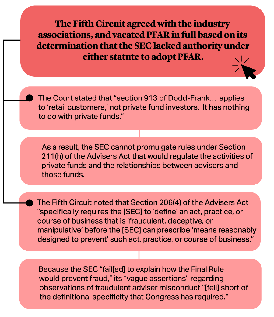 In its highly awaited opinion released on June 5, 20241, the U.S. Court of Appeals for the Fifth Circuit vacated all of the Securities and Exchange Commission’s (SEC) Private Fund Adviser rules (PFAR), agreeing with industry trade associations that the SEC lacked the necessary statutory authority to adopt PFAR.